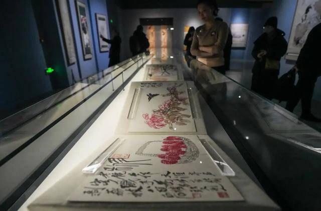 本次展览中,徐悲鸿纪念馆馆藏一级文物《白石墨妙册》首次离馆展出。徐骥介绍,徐悲鸿曾以远高于市价的方式收藏齐白石画作,以示提携与鼓励。《白石墨妙册》汇集了徐悲鸿心目中齐白石的精品,涵盖虾、鱼、蟹、花卉等多种题材。徐悲鸿盛赞齐白石的艺术“致广大,尽精微”,万物在胸,故而能妙造自然。